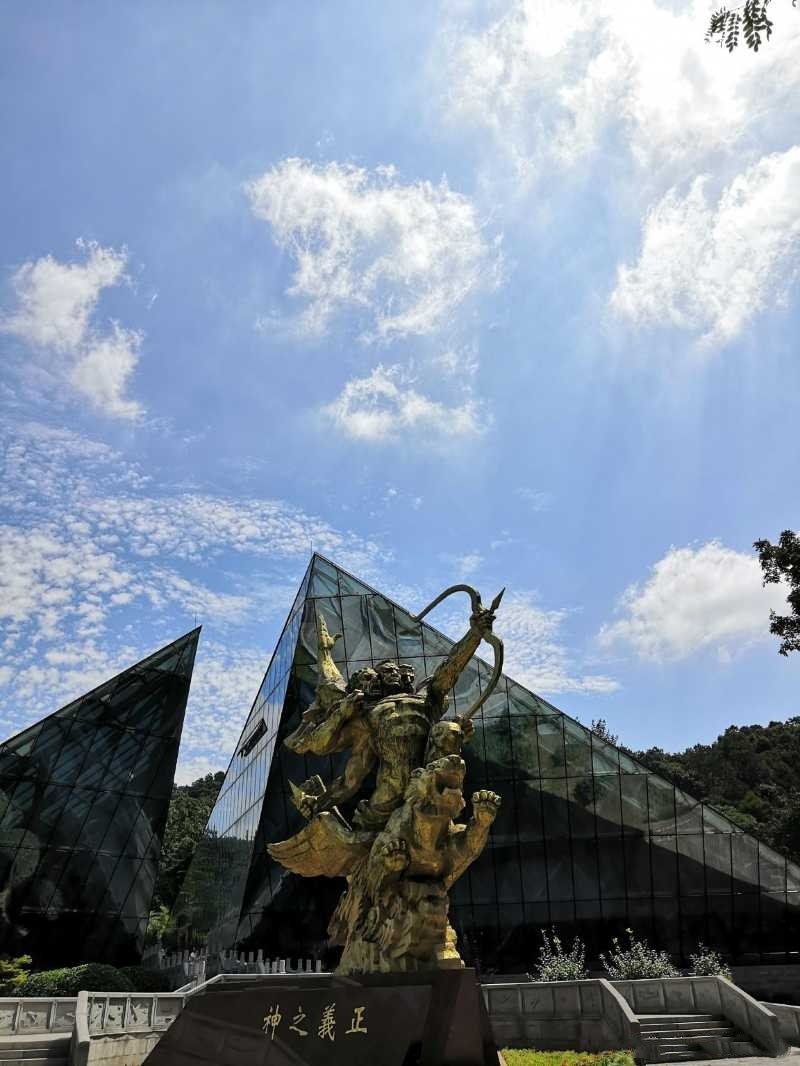 進(jìn)入紀(jì)念館大門,青銅雕塑“正義之神”映入我們眼簾,三頭六臂的正義之神跨坐在飛天虎上,手中的利箭直指長空。象征著中、蘇、美三國團(tuán)結(jié)一心聯(lián)合抗戰(zhàn)的決心和氣勢,象征著國際統(tǒng)一戰(zhàn)線的戰(zhàn)無不勝的力量。一旁的紀(jì)念碑上鐫刻著兩列墓志銘:悍國騁長空,偉績光照青史冊;凱旋埋烈骨,豐碑美媲黃花崗。